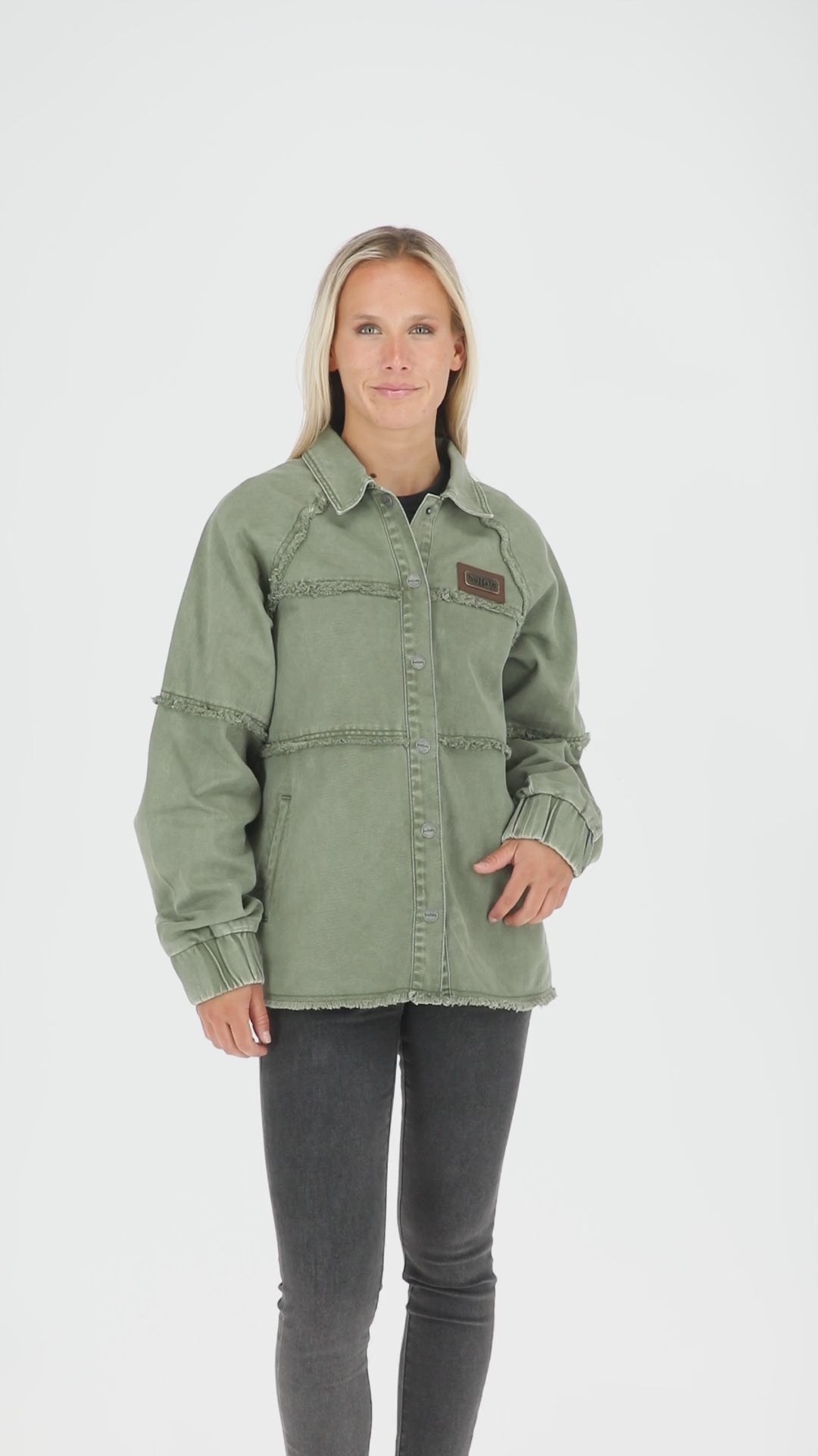 Chaqueta muy cómoda y resistente, con detalles deshilachados, botones en cierre frontal.
