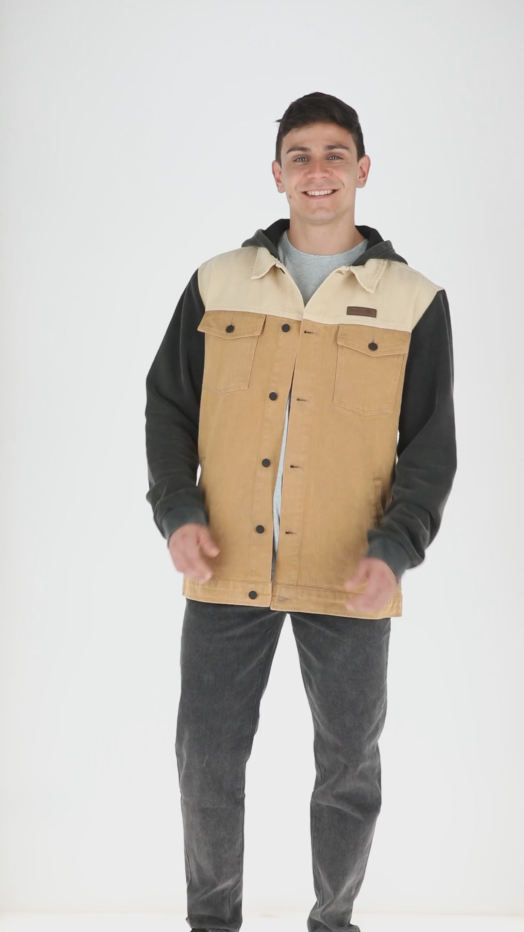 Chaqueta de jeans con mangas y capucha de franela, muy cómoda y resistente, con botones frontales.