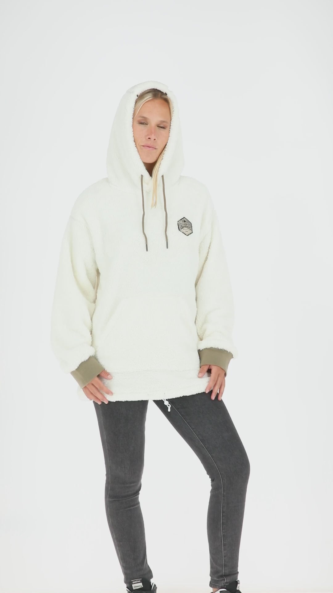 Polerón de fleece muy suave y cómodo, capucha y parte inferior con ajustes, bolsillo canguro, calce oversize.